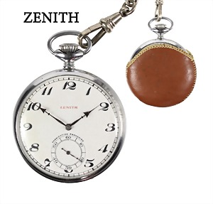 Taschenuhr, ZENITH, verchromtes Gehäuse, gut erhaltenes Emaillezifferblatt mit arabischen Zahlen, kleine Sekunde auf 6 Uhr, gebläute Zeiger, sig. ZENITH, Breguetspirale, Kompensationsunruhe, D = 47,5 mm, Taschenuhrenkette, Uhr läuft !