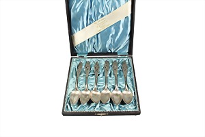6 Löffel im friesischen Stil um 1820, Silber 12 Lot, Meistermarke (keine Stadtmarke), L = ca. 15,0 cm, Original Schatulle (W. Schwarz Goldschmied Meissen)