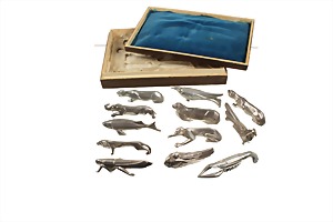 12 knife rests, France, ART-DECO 1929/'30s, silver-plated metal (worn), different animals like: elephant, grasshopper, lion, lobster/crab, fish and others, lenght = 7.8 - 10.2 cm, original wood casket c. 23 x 15 x 4 cm (1 animal was suitablereplaced, one foot of the panther is missing)
