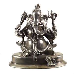 Indian deity Ganesh (Ganesh is the God of wisdom, sciences, and arts, and obstacles ) on a base, from the middle of the 20th century, silver (checked), loyal companion of the deity is the mouse or a rat, mouse at the foot of the base, the surface is partially textured or smooth, figure is plastic worked, width = c. 98.8 mm, height = 98.5 mm, total 560.2 g
