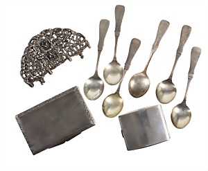 Lot: 6 Moccalöffel, Silber, signiert. MGAB (für MARKSTRÖMS GULDSMEDS AB, Schweden), L = 9,9 cm, fein gearbeitet ! Ständer auf kl. Füßen, für Karten oder Briefe, sig. ALBO, L = 86,0 mm; kl. Schminkutensil mit Spiegel u. Puderfach, zart gouillochiert, ca. 51,7 x 45,3 x 11,0 mm, beides Silber 835/00; Zigarettenetui, Silber 900/000, graviert, ca. 81,5 x 54,0 x 11,0 mm, alles total 228,0 g