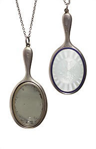 Miniatur-Handspiegel, wohl Pforzheim um 1900, Silber 900/000, Rückseite weiß und blau emailliert, aufwändig guillochiert, Gravur: La China 1.1.1928, H = 78,6 mm; Kette, Silber 835/000 L = 80,0 cm