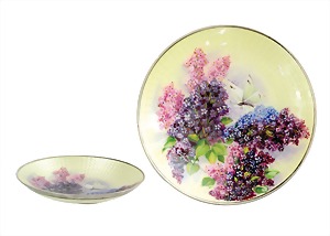 kleines Schälchen, PFORZHEIM um 1910/20, Silber (geprüft), zartgelbes transluzides Emaille, gouillochiert, feine Blütendolden mit zartgrünen Blättern, mittig ein Schmetterling KOHLWEISLING, Rückseite: zartgelbes transluzides Emaille, gouillochiert, sehr feine Arbeit ! D = 87,5 mm