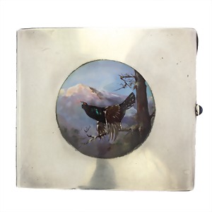 cigarette case, Pforzheim around 1900, silver 800/000, inside with fire gilding, enamel colored painted, capercaillie on a tree, mountains in the background, push piece paved with sapphirine cabochon, c. 87.8 x 78.1 x 18.2 mm, strong solidly version, nice condition ! (1 small dent)