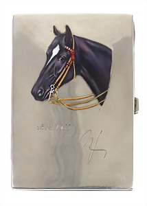 Zigaretten-Etui PFERDEKOPF, 1920/30er (wohl Pforzheim), Silber 835/000, innen feuervergoldet, feine Emaillearbeit mit Pferdekopf, graviert: 16.2.1955, Maße: ca. 100,0 x 70,8 x 11,5 mm. Solche Silberwaren in dieser Art fertigten u.a. Carl Schwitzgabel (Pforzheim)