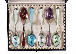 coffe spoons, Norway 1930 years, wedding spoon, sterling silver 925/000, different-colored enameled, in turquoise, yellow, purple and various blue color shades, guilloched, lenght = 9.5 cm, with original casket, high quality, very good condition !