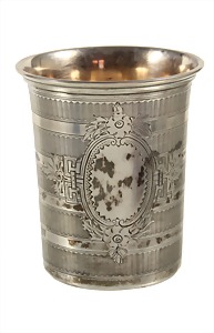 mug 1870/'80s, silver 13 lot, all round wave engraving, decorated shield for a monogram, diameter = 69.3 mm, height = 79.0 mm, total 80.0g