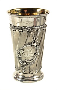 Becher Ende 19.Jhd., Silber 800/000, sig. WILKINS, Gravur: Ehrengabe zum Schützenfest in Platting von Conrad Graf Preysing-Moos, umlaufendes Wellenrelief, verziertes Schild mit Dat. 1892, innen verg., D = 76,0 mm, H = 121,2 mm, total 125,7 g