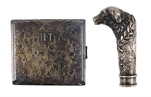 lot: 1 knob for a walking stick, dog head, German first half of the 20th century, silver 800/000, height = 95.0 mm, 1 cigarette case, alpacca, engraved on both sides, c. 91.0 x 80.0 x 15.3 mm