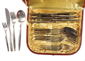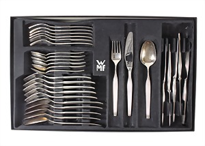 cutlery 24 pieces: WMF FÄCHER, 90 plating (silver-plated), 6 knives, lenght = 25.5 cm, 6 forks, lenght = 14.7 cm and 6 spoons, lenght = 20.7 cm, 6 coffee spoons, lenght = 14 cm, cutlery box c. 46.0 x 22.0 x 5.0 cm