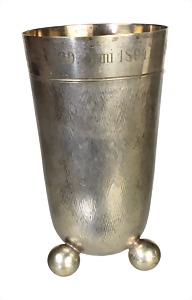 Kugelfußbecher, Silber 800/000, Inschrift: SEGEL WETTFAHRT KIEL-TRAVEMÜNDE 29.Juni 1894, sehr fein gearbeitete Oberfläche (Hammerschlagstruktur), Korpus mit leicht erweiternder Wandung, auf drei Kugelfüßen D = ca. 9,3 cm, H = 16,0 cm, schöner Zustand, total 328 g