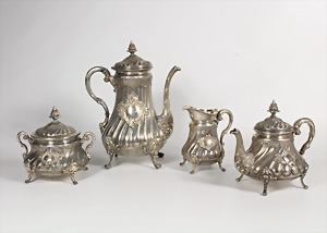 Lot: Kaffee/Teeservice, Ende 19.Jhd., Silber 800/000, HALLER & RATHENAU BERLIN (Wilkens), 1 Teekanne, H = 16,0 cm; 1 Kaffeekanne, H = 26,0 cm (beide Kannen mit Scharnierdeckel und Hitzeschutz an den Griffen); 1 Zuckerdose u. 1 Milchkännchen, seitliche Gravurschilder: 1862 5t Sept.1887 u. Monogramm: NSC. Der Korpus ist geschwungen ausgeformt und mit Blüten -und Blattdekor verziert, vier nach außen gestellte Füße, alles total 1770 g