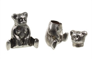 a pair of salt and pepper caster around 1910/'20s, 2 bears, silver (checked) not marked (probably German), plastic worked, fine textured surface, head is removable and rotatable, height = c. 42.0 mm