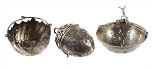 lot: tea utensils, 2 tea strainers for the Teapot spout, 1 tea ball, silver 800/000, height = 58.3 mm