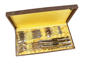 cutlery case H.MEYEN & CO BERLIN HOF-SILBERWARENFABRIK around 1880, silver 14 lot (875/000), signed: H. MEYEN & Co. Spaten, 12 pieces with monogram SN or NS. 24 big forks lenght = 20.6 cm and 12 knives lenght = 25.2 cm, dessert: always 12 forks lenght = 17.3 cm, 12 knives lenght = 21,8, 12 spoons lenght = 18.2 cm, 12 coffe spoons lenght = 15.0 cm, 12 fruit knife lenght = 18.7 cm, 1 butter knife, 1 cheese knife and 1 big serving spoon lenght = 26.7 cm, total 4130 g (weighed without knives!). handmade original case, covered with leather, case size: 49.0 x 37.0 x 17.5 cm