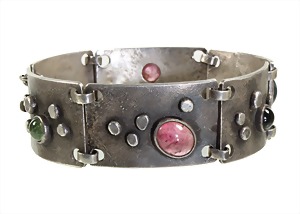 Lot: Silberschmuck, 925/000, 1 Armreif mit farbigen Steinen, u.a. Citrin, Amethyst, Peridot, Topas…u.a., Kastenschloss mit 2 Sicherheitsachten, innen ca. 61,0 x 49,5 mm; 1 Paar Creolen (oval), H = 29,0 mm; 1 Ring, farbloser Strass; 1 Ring, farbiger Tropfen ca. 15,2 x 20,8 mm; 1 Ring, regenbogenfarben, über Kreuz 4 rote Steine u. farbloser Strass, alle Ringe RW ca. 60, total ca.79,8 g