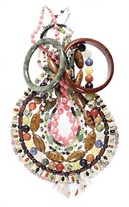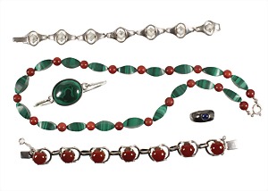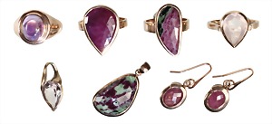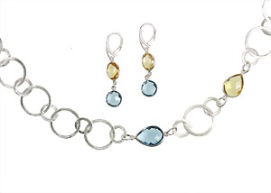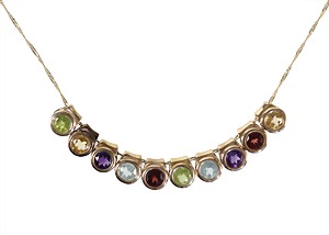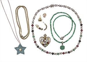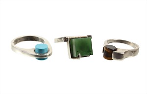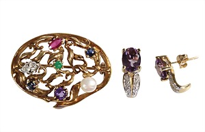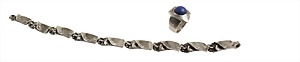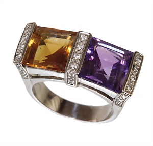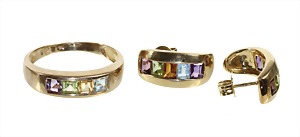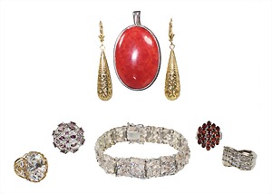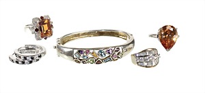 lot: silver jewelry, 925/000, 1 bracelet with colored stones, among others citrine, amethyst, peridot, topaz …and others, box clasp with 2 safety catches, inside c. 61.0 x 49.5 mm, a pair of hoop earrings (oval), height = 29.0 mm, 1 ring, colorless rhinestone, 1 ring, colored drop c. 15.2 x 20.8 mm, 1 ring, rainbow-colored, cross-wise 4 red stones and colorless rhinestone, all rings with a ring width of c. 60, total c. 79.8 g