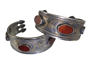 lot: 2 bangles/bangles of the Turkmens, Afghanistan first half 20th century, silver, partly gilded, surface with ornaments, 3 carnelian plates, width = 30.0 mm, inside c. 60.0 x 50.0 mm, total 199.0 g