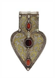 pendant (back-ornamental plate) of the Turkmens, Afghanistan first half 20th century, silver, partly gilded, surface with ornament, 3 carnelian plates, width = 94.3 mm, height = 15.5 mm, total 81.1 g