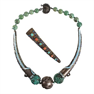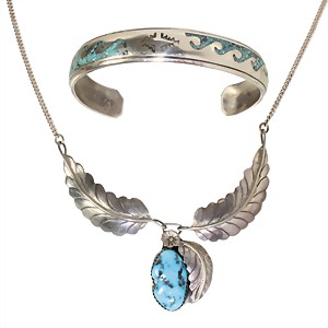 Lot: INDIANER-Schmuck, Silber 925/000 (STERLING), Armreif/Spange mit Türkisornament, sig. NAKAI, B = 10,7 mm, innen ca. 59,0 x 47,0 mm; Collier, BLÄTTER mit Türkis-Anhänger, vorne H = ca. 28,7 mm, L = ca. 40,0 cm