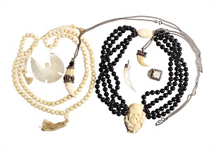 lot: 1 chain, ivory, lenght = ca.70.0 cm, 3-row chain, onyx, carved Buddah made of ivory (probably China), black ornaments on both sides , height = 48.5 mm, chain, ivory-twist-lock, lenght = 41.5 cm, 1 pendant with claw and 1 pendant with predator tooth, 1 silver ring with opal, 2 nacre jewelry