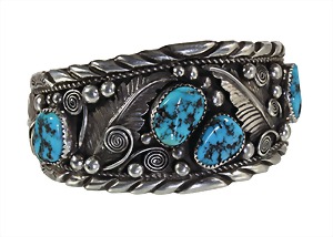 Armreif/Spange 1960/70er Jahre, Silber 925/000, sig. L - R - JAKE SN 925, 5 Türkise, reich mit Federn u. Spiralen verziert, Reif: B = 36,7 mm, Innen: ca. 61,5 x 52,0 mm, total ca. 71,0 g