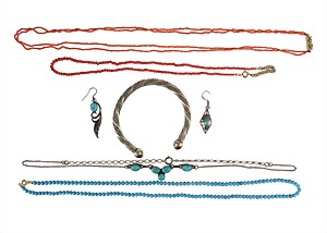 lot: jewelry from India/Nepal, 1 very fine double-strand coral necklace diameter = 1.8 mm, gilded clasp, lenght = c. 65.0 cm, 1 coral necklace, chain extender (gilded), lenght = c. 48.5 cm, 1 necklace probably turquoise lenght = 61.0 cm, 1 silver necklace with 5 turquoise cabochons lenght = c. 60.0 cm, 2 pairs silver 925/000 ear pendants with turquoises height = 46.5 and 59.0 mm, 1 silver-colored bracelet, diameter = c. 68.0 mm shipping only within the EU !