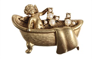 Brosche, goldfarben (matt), sig. Piscitelli Made in USA, ein Engel in einer Badewanne, verziert mit Kunstperlen, ca. 43,0 x 30,0 mm