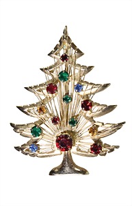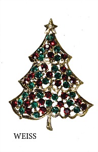 Brosche, Weihnachtsbaum, goldfarben, sig. WEISS (USA), farbige, rote und grüne Strasssteine in unterschlichen Größen, ca. 51,5 x 67,7 mm