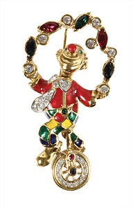 Brosche, CLOWNC auf einem Einrad, goldfarben, sig., A & S (Altwood & Sawyer, England), farbiger Emaillelack, farbloser Strass, rot-, blau- u. grünfarbener Strass, H = 59,0 mm