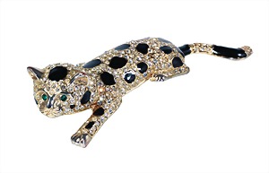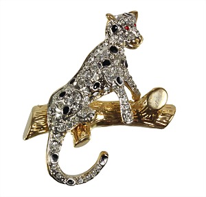 Brosche, goldfarbene, Leopard auf einem Ast, unsig., schwarzer Emaillelack und klarer Strassbesatz, rote Augen, ca. 45,0 x 30,5 mm