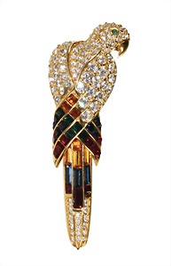 big brooch, parrot, gold colored, unsigned, clear rhinestones and colored carré stoned and stones with baguette cut, height = 81.5 mm
