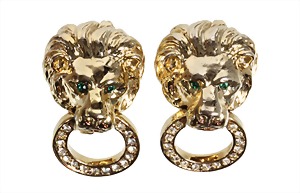 ear clips, gold colored, unsigned, lion heads in Door-Knocker-style decorated with white and green rhinestones, height = c. 33.5 mm