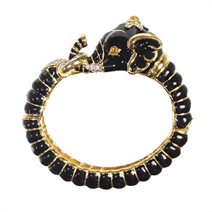bangle elephant, gold colored, signed Kenneth Jay Lane (KJL), black enamel coating, studded with colorless rhinestones, citrine-colored cabochon (on head and eyes), bangle with spring mechanics, inside c. 59.6 x 46.4 mm