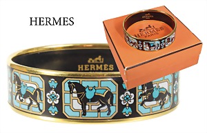 bracelet by HERMES, signed HERMES PARIS, colored enameled, elaborate horse decor with turquoise-blue colors, bordered with thin golden ribbons, width = 18.2 mm, inside diameter = 62.0 mm, original casket ! very good condition