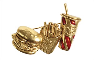Originelle Brosche " burger, fries and shake ", goldfarben, sig. Dancecraft, plastisch ausgearbeitet, Akzente mit rotem Emaillelack, ca. 63,5 x 41,5 mm