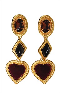 decorative ear clips, gold colored, signed Christian Lacroix (France), three-part with hanging heart, height = 88.5 mm
