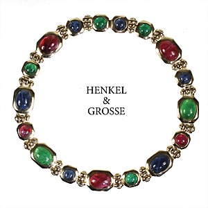 splendid, gold colored necklace by Henkel und Grosse , Pforzheim, signed big, jeweled with ruby, sapphire and emerald colored glass cabochons (circular and oval), width = 17.8 mm, lenght = c. 43.0 cm