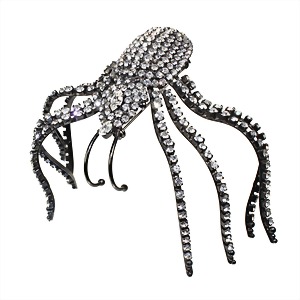 big brooch, spider, unsigned, blackened metal, luxuriant studded with clear rhinestones, plastic worked, c. 78.0 x 100.0 mm, cloth bag