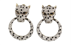 unusual ear clips Italy, PHANTER/LEOPARD, silver 925/000, signed CAM-BER, plastic worked head, studded with white and black rhinestones, ring is moveable, height = 46.0 mm