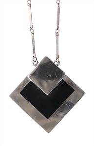 pendant/necklace, BENGEL Idar-Oberstein, ART-DECO 1932 years, chromium-platedmetal , galalith , squares at a square little sticks chain , lenght = 44.5 cm, literature: BENGEL ART DECO UND SCHMUCK page 56 (similar motifs)