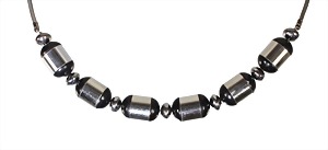 necklace, probably BENGEL Idar-Oberstein, unsigned, ART-DECO 1930s, chromium-plated metal , galalith , stern circular cylinder with hemispherical ends, between some lentils, snake chain, lenght = 48.5 cm