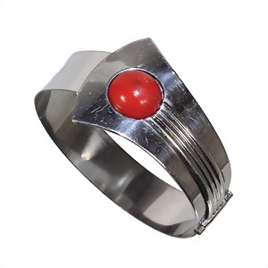 bracelet, probably Jakob BENGEL Idar-Oberstein, ART-DECO 1930 years, chromium-plated metal , with red galalith hemisphere, can be open by a hinge movement (hooks up behind the red hemisphere), inside diameter: = c.- 57.3 mm, width at the top: = 31.2 mm