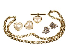Lot: Schmuck von Monet/S.A.L.O, Metall goldfarben, sig. MONET, 1 Paar dekorative Ohrstecker in HERZ-Form u. 1 Brosche ca. 40,8 x 33,0 mm; 1 Kette L = ca. 60,0 cm; 1 Paar Stecker mit farblosem Strassbesatz, sig. SALO