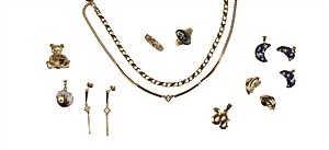 lot: fashion jewelry by PIERE LANG, signed, gold colored metal , 2 rings ring width c. 54.5 and 57, 2 pendant, snake and hedgehog, 2 pairs of ear studs, 3 chains/necklaces (1 chain with pendant), 1 brooch, bear signed 1928, red rhinestone heart-shaped height = 24.8 mm, 1 set: moon, unsigned, blue enamel coating