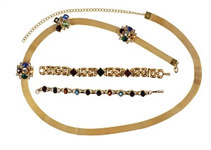 lot: gold colored metal , 2 decorative bracelets, colored set with stones, lenght = 17.5 and 19.0 cm, 1 belt, 3 rosettes that are jeweled with color rhinestone, diameter = c. 28.5 mm, lenght = 79.0 - 98.5 cm