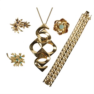 Lot Modeschmuck Fa. GROSSE Pforzheim, Metall gelbfarben, alle signiert: Grosse MADE IN GERMANY, 1 Armband 1961, L = 18,0 cm; 1 Brosche 1965 ca. 45,5 x 32,5 mm; 1 Brosche BLUME D = 37,7 mm, beide mit türkisfarbenen Steinen; 1 Brosche 1962 mit Lapiskugeln und ein dekorativer Anhänger für die Abendgarderobe von 1972, H = 106,8 mm, Kette L = 60,0 cm