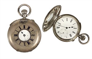 men's pocket watch, HALF HUNTER around 1900, 1/4 hours repetition, spring-cover, silver 935/000, white enamel clockface, Roman numbers (inside and outside), very fine blued hand, small second on 6 o'clock, breguet hairspring, patent April 1182, diameter = 53.2 mm, clock is running !