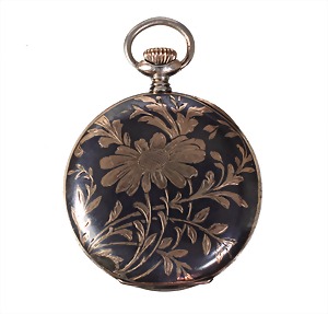 cylinder pocket watch around 1915, yellow gold 585/000 (tested), white enamel clockface, Roman numbers, fine golden hand, between bottom (metal), elaborate engraved case, delicate enamel inserts, diameter = 32.8 mm, clock doesn't start running, total 27.4 g