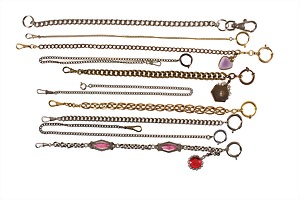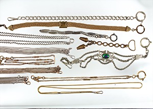 12 Uhrenketten: 1 Kette um 1870/80 aus geflochtenem Haar, L = 32,5 cm; 1 Kette, JUGENDSTIL um 1900 mit Pfauenauge, L = 27,5 cm, und 10 andere Ketten, teilweise in SILBER gearbeitet